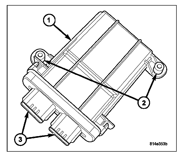 Two mounting tabs (2) and two connector receptacles (3) are integral to the OCM housing. The connector receptacles contain terminal pins that connect the OCM to the vehicle electrical system through a dedicated take out and connector of the passenger side front seat wire harness, and a second take out and connector of the body wire harness.