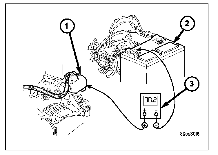 5. Connect positive lead of voltmeter (3) to starter housing (1). Connect negative lead of voltmeter to negative battery terminal post. Rotate and hold ignition switch in Start position. Observe voltmeter. If reading is above 0.2 volt, correct poor starter to engine block ground contact.