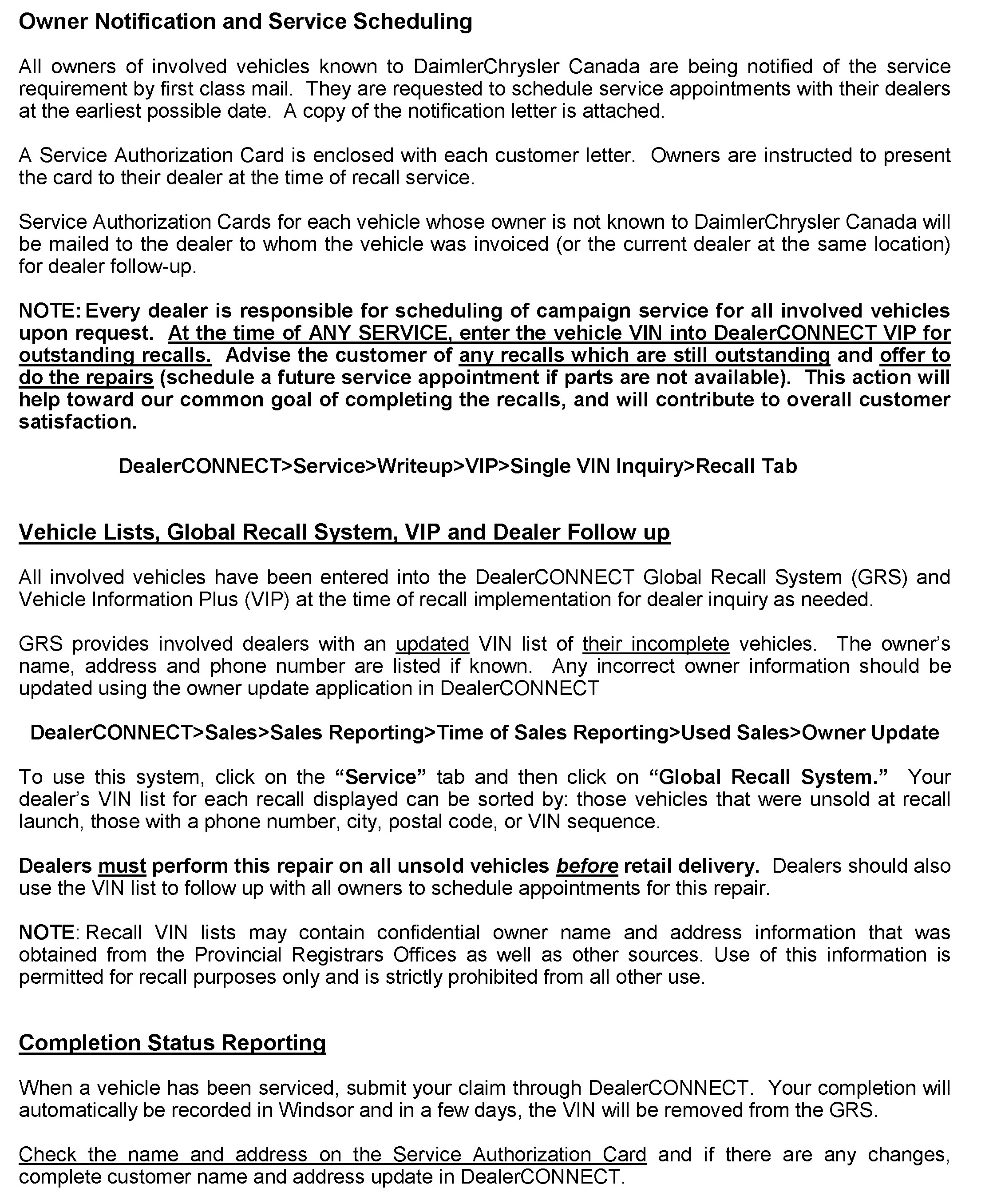Global Recall System(GRS) has been developed to provide dealers with an up-to-date list of involved vehicles by recall number and by dealer code. Owners known to DaimlerChrysler are also listed. Involved vehicles will be removed from GRS within several days of submitting repair claims.