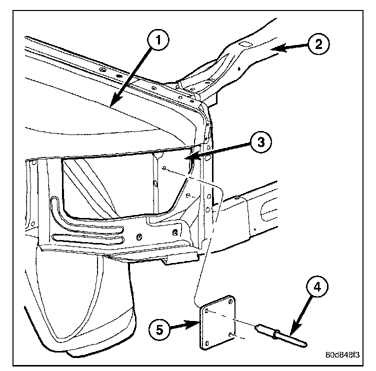 The Body Code Plate is located on the right front hydroform fender rail just behind the headlight assembly. There are seven lines of information on the body code plate. Lines 5, 6, and 7 are not used. Information reads from left to right, starting with line 4 in the center of the plate to line 1 at the bottom of the plate.