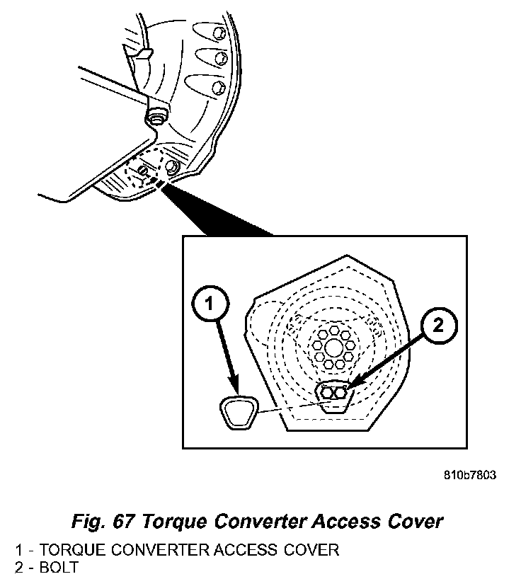 f. Install the plastic torque converter access cover (1) (Fig. 67) to the back of the engine flange.