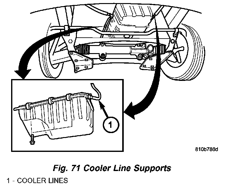 a. Install the brackets for the oil cooler feed and return lines (1) (Fig. 71) onto the engine oil pan flange. Detail shows right side of motor. Position is mirrored for the left side of engine.