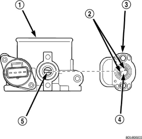 The throttle shaft end of throttle body (5) slides into a socket in TPS (4). The TPS must be installed so that it can be rotated a few degrees. If sensor will not rotate, install sensor with throttle shaft on other side of socket tangs. The TPS will be under slight tension when rotated.