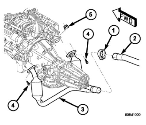 4. Position catalytic converter assembly (3) to exhaust manifold and install flange nuts (5) and bolts (4). Hand tighten at this time.