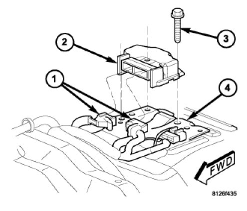 1. Carefully position the Occupant Restraint Controller (ORC) (2) to the ORC bracket (4) on the floor panel transmission tunnel. When the ORC is correctly positioned, the arrow on the ORC label will be pointed forward in the vehicle and the locating pin on the bottom of the right ORC mounting flange will be engaged into the locating hole in the ORC bracket.