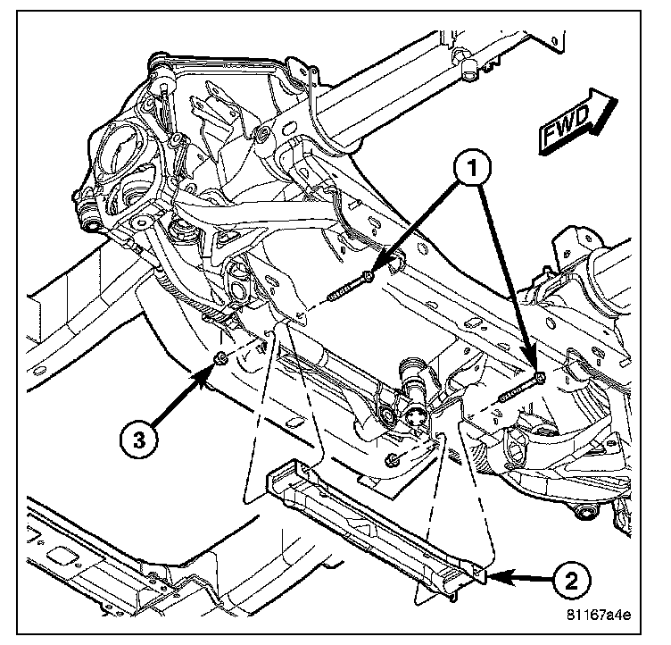 2. Remove the bolts (1) and nuts (3) and remove the crossmember (2).