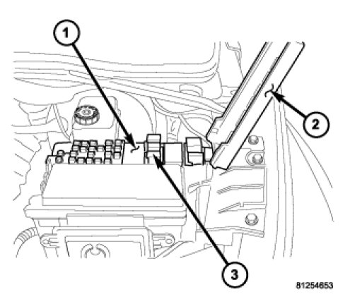 1. Position the A/C clutch relay (3) into the proper receptacle of the PDC (1).