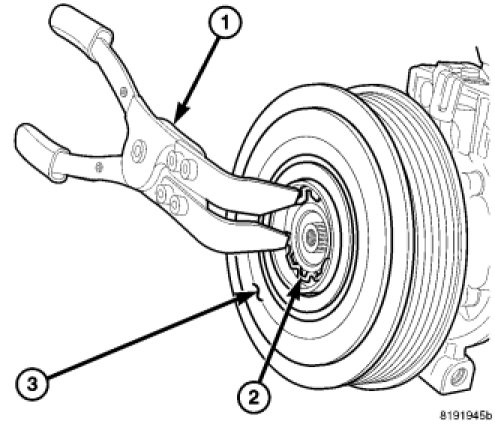 4. Using Snap Ring Pliers 9764 or equivalent (1), install the snap ring (2) that secures the pulley and bearing assembly (3) to the front of the A/C compressor. Be certain that the snap ring is fully and properly seated in the groove.