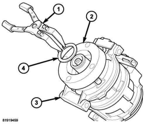 2. Using Snap Ring Pliers 9764 or equivalent (1), install the snap ring (4) that secures the compressor clutch field coil to the front of the A/C compressor. Be certain that the snap ring is fully and properly seated in the groove and oriented correctly.