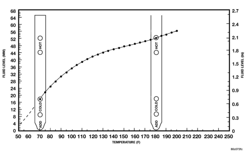 9. Adjust transmission fluid level shown on the dipstick according to the Transmission Fluid Temperature Chart.