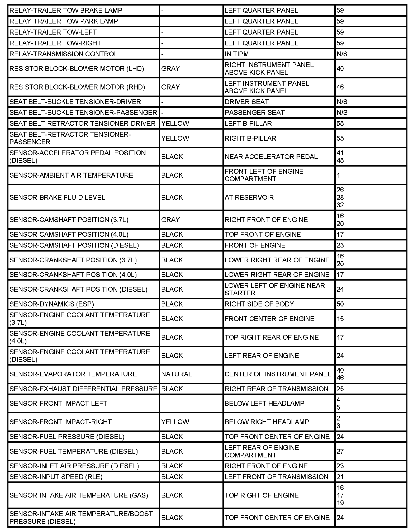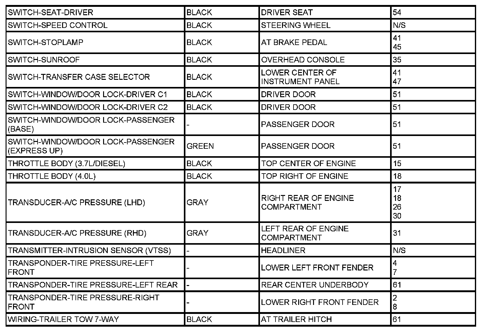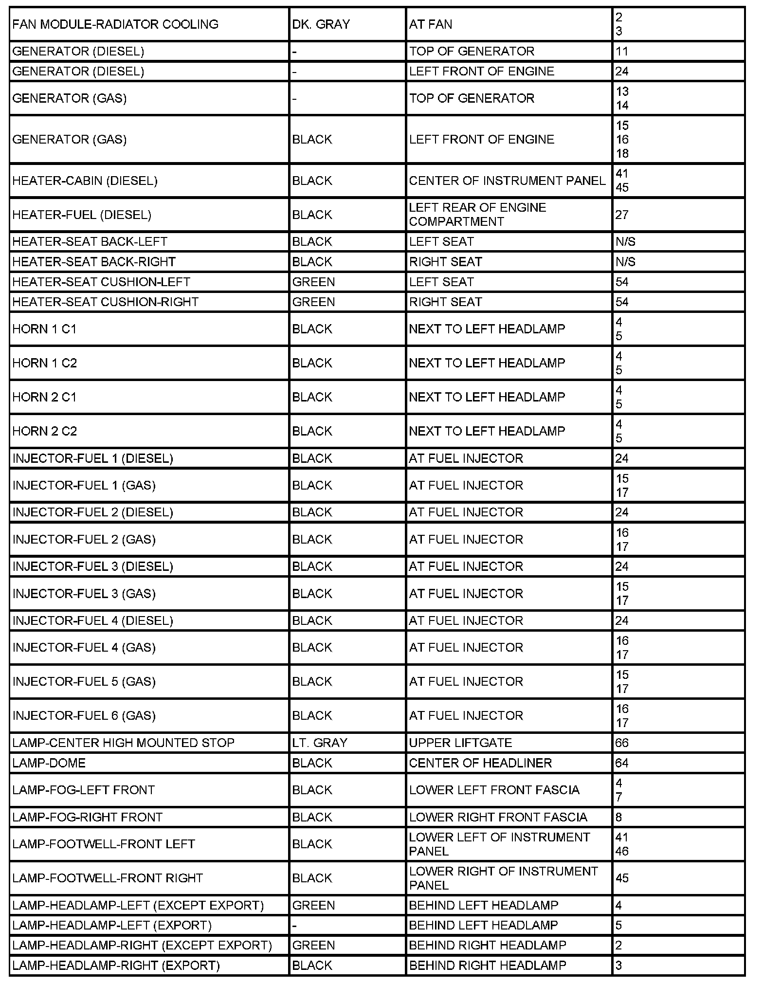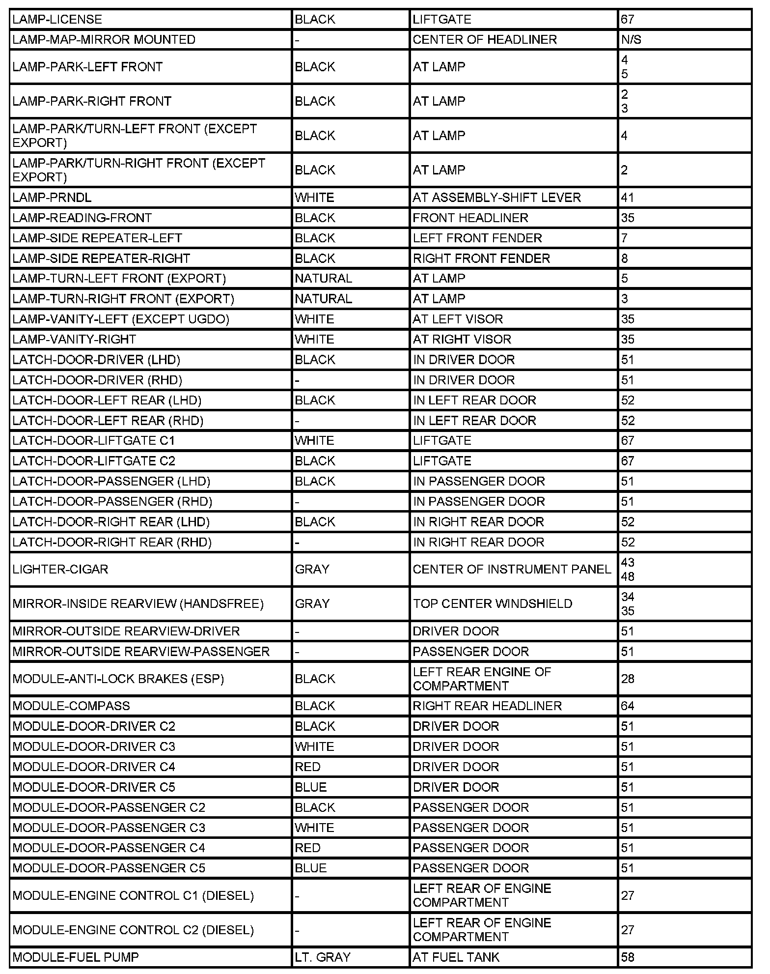 The abbreviation T/O (Take Out) is used in the location column to indicate a point in which the wiring harness branches out to a component.