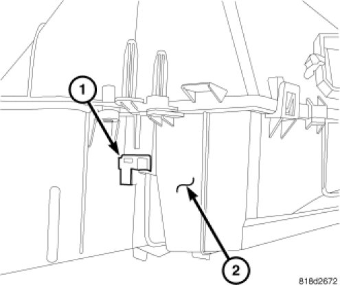1. Install the evaporator temperature sensor (1) into rear of the HVAC housing (2) and connect the instrument panel wire harness connector.
