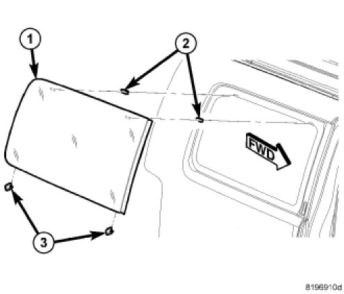 7. Position quarter glass (1) into window opening and lock clips into place.