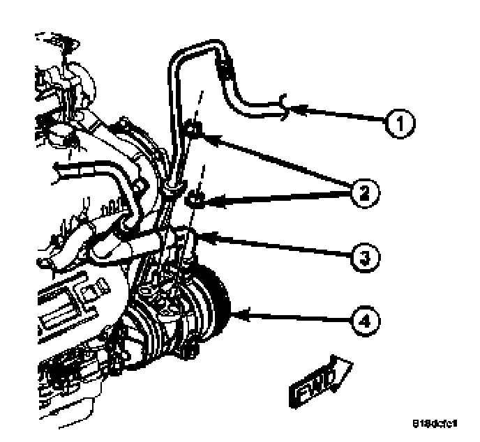 5. Remove the nuts (2) that secure the A/C discharge line (1) and the A/C suction line (3) to the A/C compressor (4).