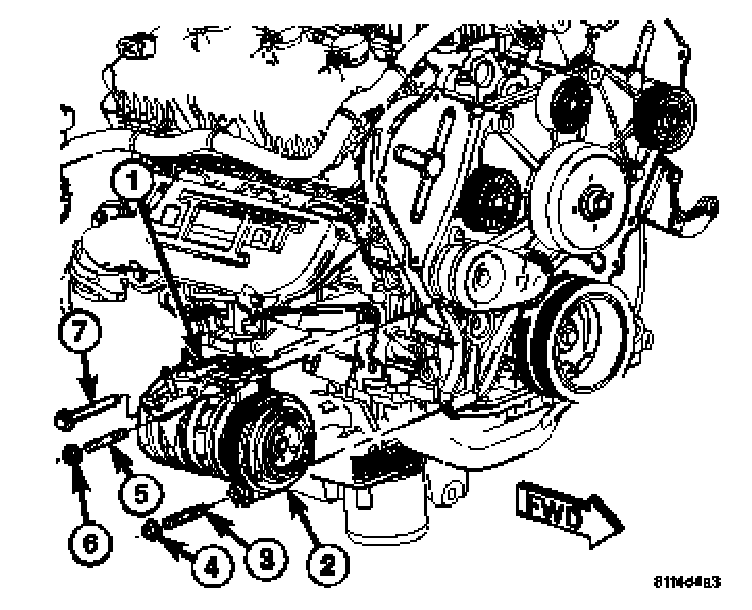 15. Remove the bolt (7) that secures the rear of the A/C compressor to the engine.
