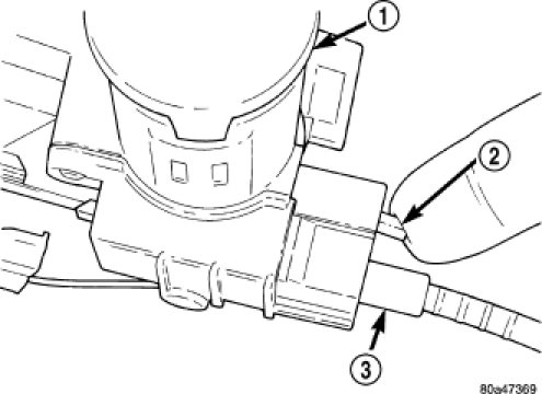 1. Push the park-interlock cable (3) straight into the square mounting hole in the steering column until cable snaps in place.