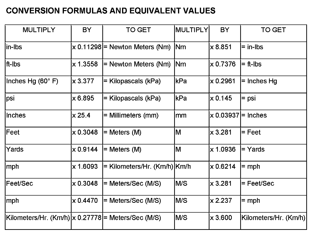 The following chart will assist in converting metric units to equivalent English and SAE units, or vise versa.