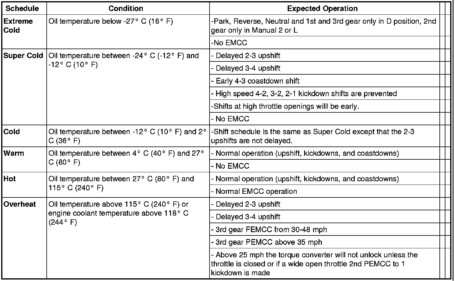 As driving conditions change, the TCM appropriately adjusts the shift schedule. Refer to the following chart to determine the appropriate operation expected, depending on driving conditions.