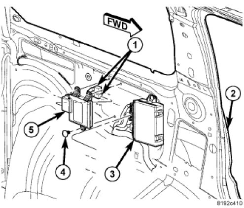 2. Secure the module to the left quarter inner panel using three plastic push-in fasteners (4).