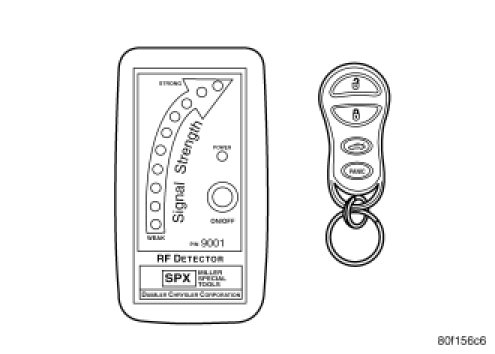 Using special tool 9001, first test to ensure that the transmitter is functioning. Typical testing distance is 2.5 centimeters (1 inch) for Asian transmitters and 30.5 centimeters (12 inches) for all others. To test, position the transmitter as shown. Press any transmitter button, then test each button individually. The tool will beep if a radio signal strength that lights five or more LED's is detected. Repeat this test three times. If transmitter fails any of the test refer to the proper Diagnostic Procedures information.