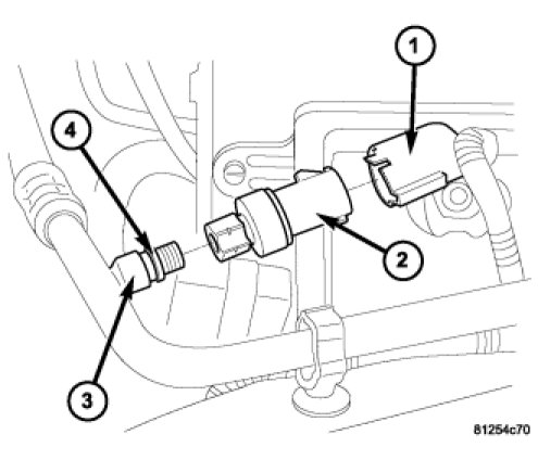 2. Install the A/C pressure transducer (2) onto the discharge line fitting. Tighten the A/C pressure transducer securely.