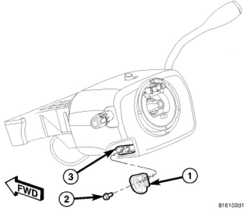 2. Remove the screw (2) that secures the tilt steering column knob (1) and remove it from the tilt actuator (3) on the left side of the column.
