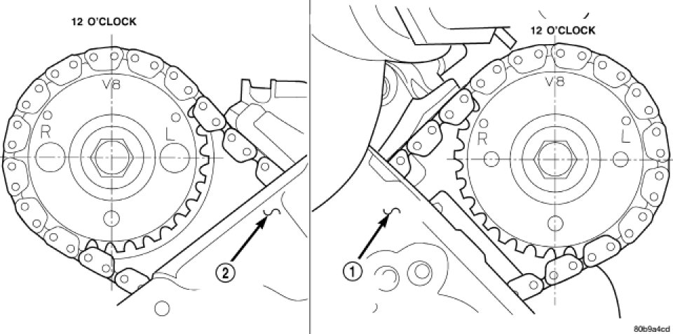 4. Re-index the camshaft drive gear in the chain until the V8 mark is at the same position as the V8 mark on the opposite camshaft drive gear.