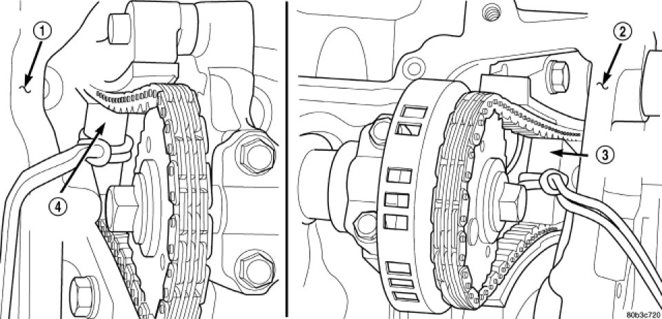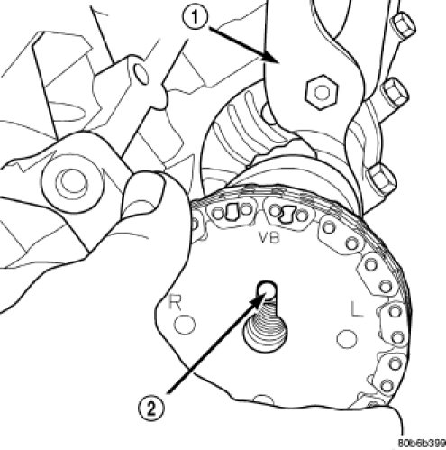 1. Using Chain Tensioner Wedge, special tool 9867 (3), stabilize the secondary chain drive. For reference purposes, mark the chain-to-sprocket position.