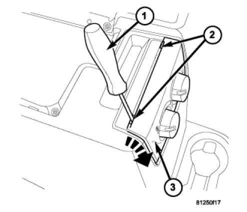 2. Using a small screwdriver or similar flat blade tool (1), gently push down on the clip retainer (2) located at each top corner of the rear A/C-heater control (3). Rotate the top of rear A/C-heater control downwards to release the two bottom retaining tabs from the slots in the center floor console.