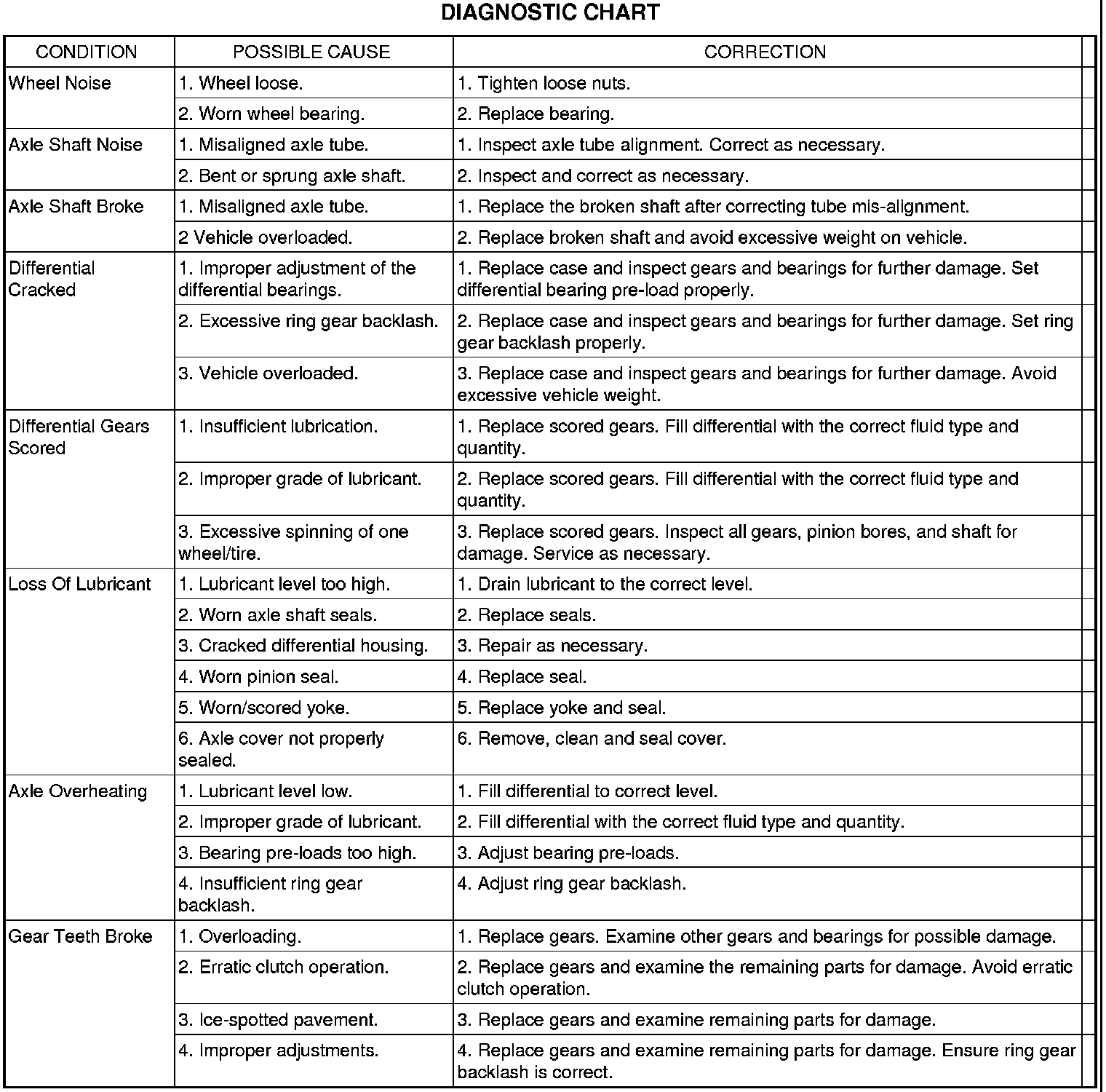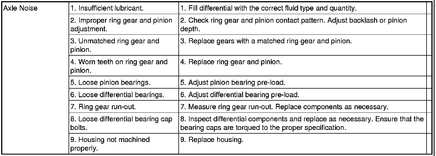 When road testing, first warm-up the axle fluid by driving the vehicle at least 5 miles and then accelerate the vehicle to the speed range where the noise is the greatest. Shift out-of-gear and coast through the peak-noise range. If the noise stops or changes greatly check for: