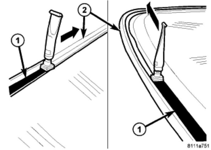 1. Apply bead of adhesive (1) with a triangular nozzle directly to the quarter glass seal starting at bottom in center of the quarter glass.