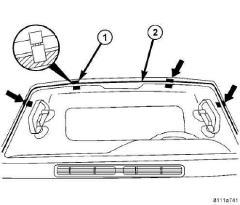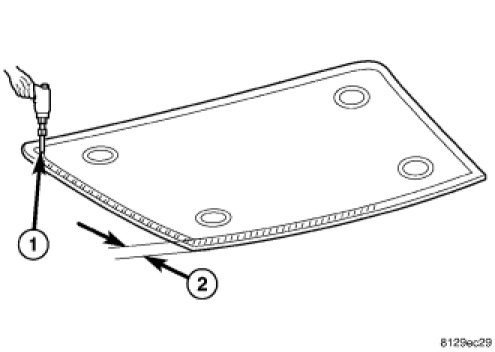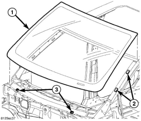 1. Apply bead of adhesive (1) with a triangular nozzle directly to the windshield seal starting at bottom in center of windshield.