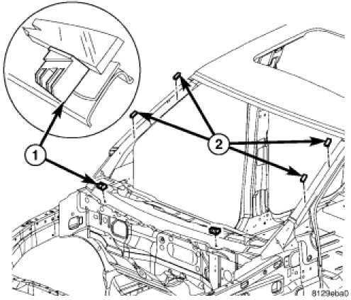 1. Apply four new spacers (2) to the A-pillars and place them evenly apart at the top and bottom.