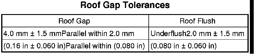 6. Adjust the lower spacers (3) as required, to obtain the specified roof gap tolerance by pushing on the side of the wedge and raising or lowering the glass as necessary. For roof gap specifications, refer to the table Roof Gap Tolerances.