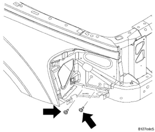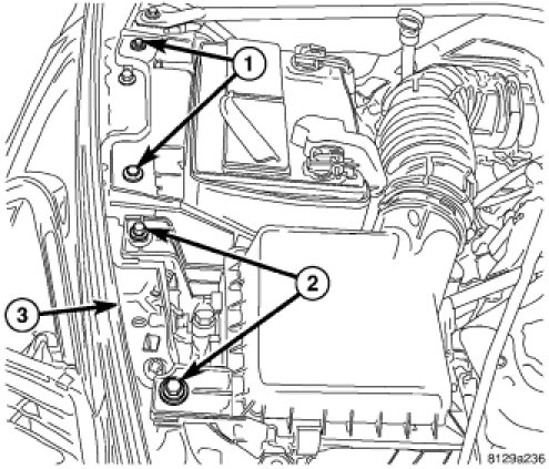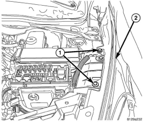 6. When servicing the left side fender, remove the power distribution center bolts (1) from the front end sheet metal (2).