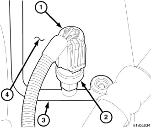 2. Disconnect the wire harness connector (1) from the A/C pressure transducer (2) located on the A/C liquid line (3) near the dash panel (4) in the engine compartment.
