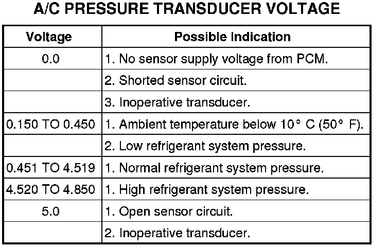 The A/C pressure transducer is tested using a scan tool. Before testing the A/C pressure transducer, be certain that the transducer wire harness connection is clean of corrosion and properly connected. For the A/C to operate, an A/C pressure transducer voltage reading between 0.451 and 4.519 volts is required. Voltages outside this range indicate a low or high refrigerant system pressure condition to the powertrain control module (PCM). The PCM is programmed to respond to a low or high refrigerant system pressure by suppressing operation of the A/C compressor. Refer to the A/C Pressure Transducer Voltage chart for the possible conditions indicated by the transducer voltage reading.