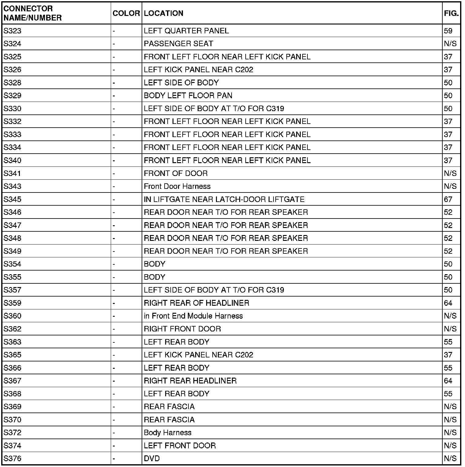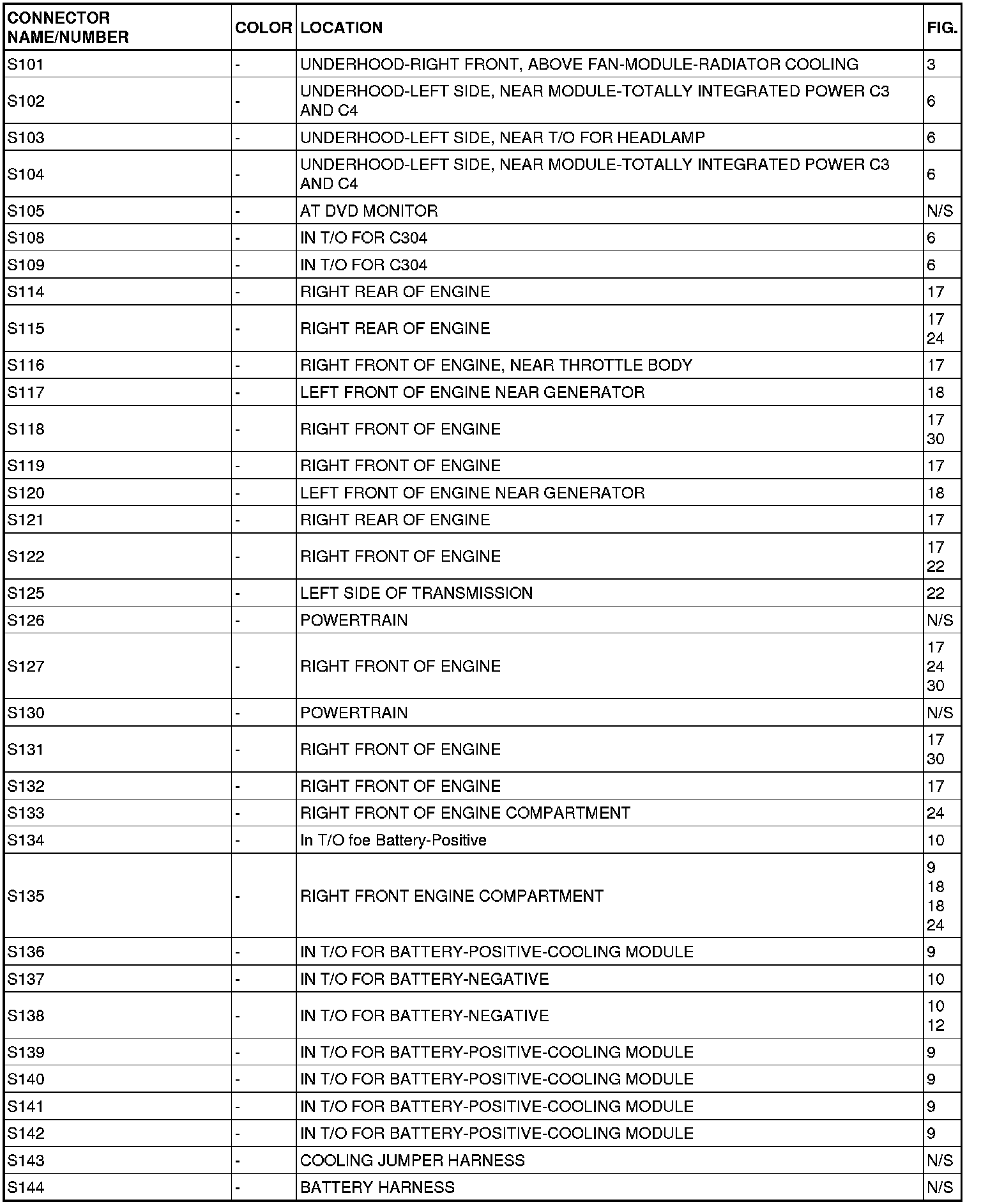This section provides illustrations identifying connector, ground and splice locations in the vehicle. Connector, ground and splice indexes are provided. Use the wiring diagrams in each section for connector, ground and splice identification. Refer to the appropriate index for the proper figure number. For items that are not shown in this section N/S is placed in the Fig. column.