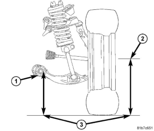 4. Front - On each side of the vehicle, measure the distance from the center of the front lower control arm bushing bolt (1) to the ground (3) Record the measurement. Next measure the distance from the spindle center (2) to the ground (3) Record the measurement.