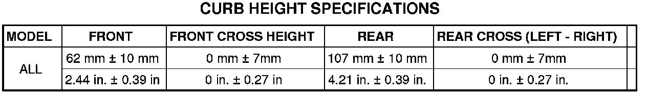 Front and rear curb heights are not adjustable. The spring selections at assembly determine curb height for acceptable appearance of the vehicle. Curb height dimensions assume full fluids (including fuel) and zero passengers. Refer to the table below for front curb height dimensions.