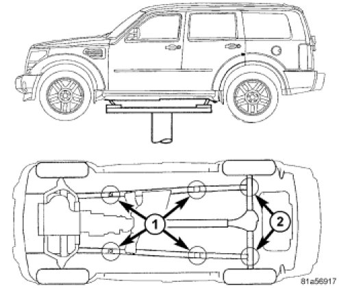 WARNING: The hoisting and jack lifting points provided are for a complete vehicle. When a chassis or drivetrain component is removed from a vehicle, the center of gravity is altered making some hoisting conditions unstable. Properly support or secure vehicle to hoisting device when these conditions exist.