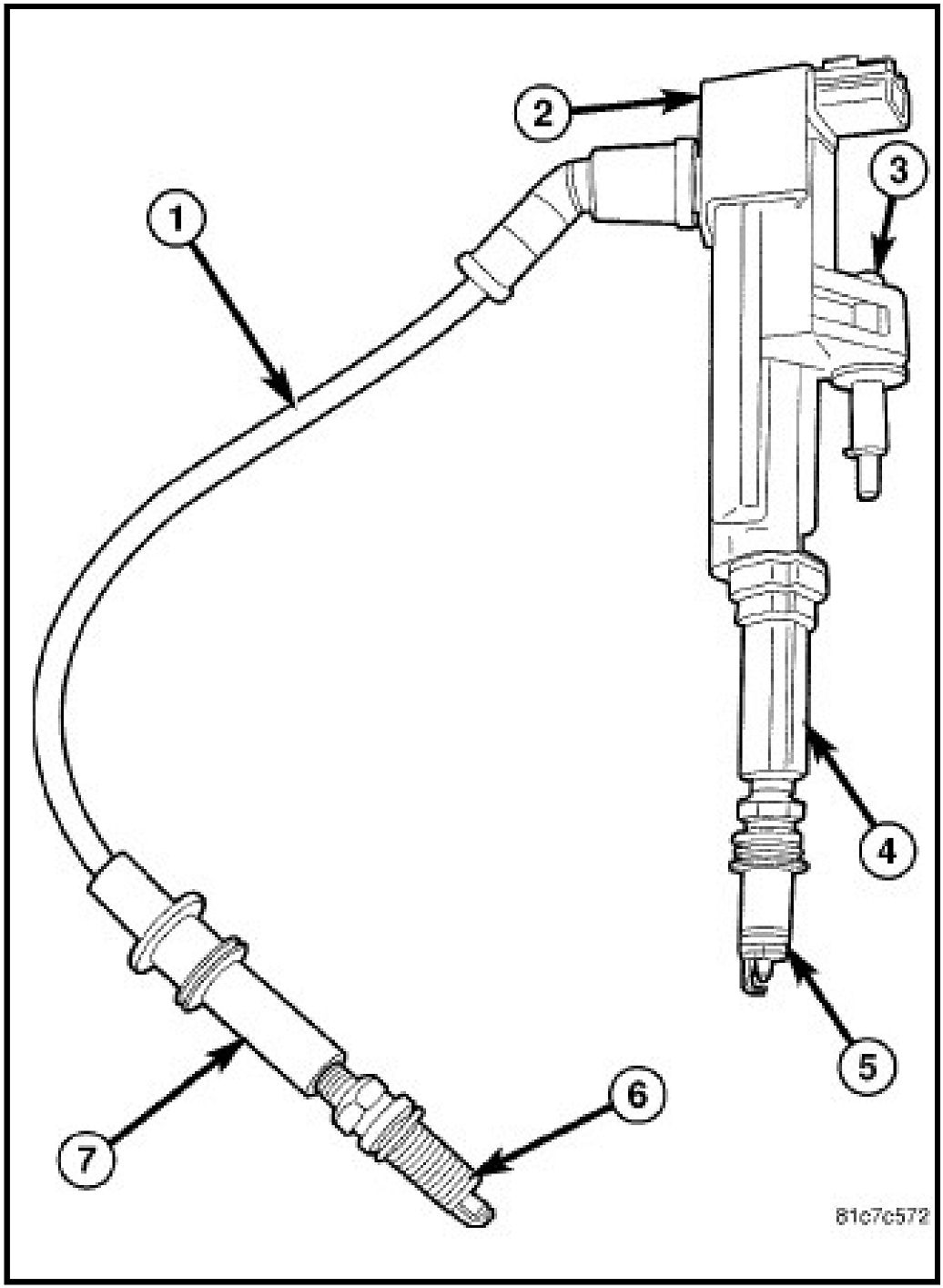 This engine shares an ignition coil (2) and an ignition cable (1) between the two cylinders. The three coils fit into machined holes in the cylinder head for cylinders 1, 3, and 5. Rubber boots seal the secondary terminal ends of the coils to the top of the spark plugs. The spring is used for a mechanical contact between the coil and the top of the spark plug. These rubber boots and springs are a permanent part of the coil and are not serviced separately. An O-ring is used to seal the coil at the opening into the cylinder head. A separate electrical connector is used for each coil.