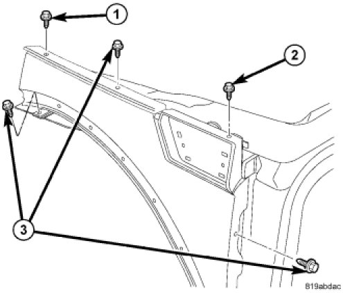 1. Align the fender with adjacent body parts, install and tighten bolt (2) first then tighten bolt (1) then all remaining bolts (3). Tighten all bolts to 9 Nm (80 in. lbs.). Make sure there are no excessive gaps between the fender and the door assemblies, .