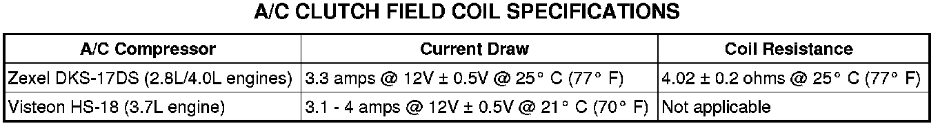 12. Refer to the following A/C Clutch Field Coil Specifications chart for the acceptable A/C clutch coil resistance.