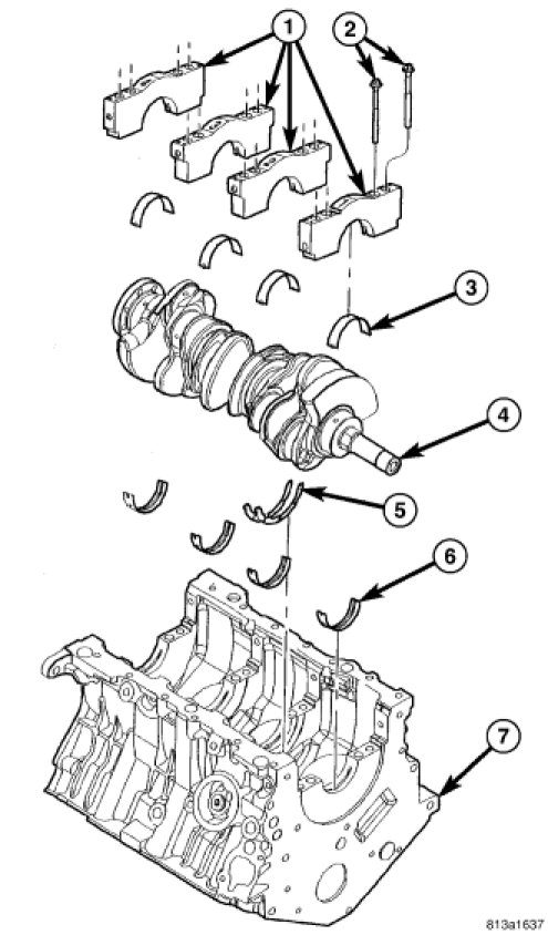 - Install each main cap (1) and tighten bolts finger tight.The main bearing cap bolts (2) must be tightened in the proper sequence. First the inner main cap bolts (2), secondly the windage tray bolts, lastly the main cap tie (horizontal) bolts (6).