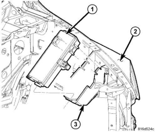 3. Turn the TIPM (1) so that the connector side is facing down. Install the assembly onto the TIPM battery tray bracket (3) making sure to line up the lower retaining tab with the retaining slot in the tray (1).