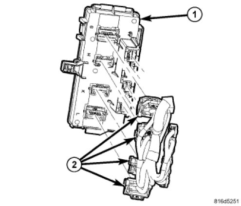 2. Connect the electrical connectors (2) by pushing straight on and rotating the connector arm inboard, until the connector is firmly locked in place on the TIPM assembly (1).