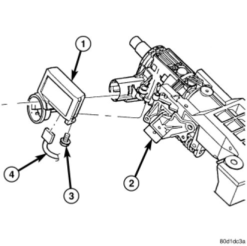 1. Position the Sentry Key REmote Entry Module (SKREEM) (1) onto the steering column (2) with the antenna ring oriented around the ignition lock cylinder housing.