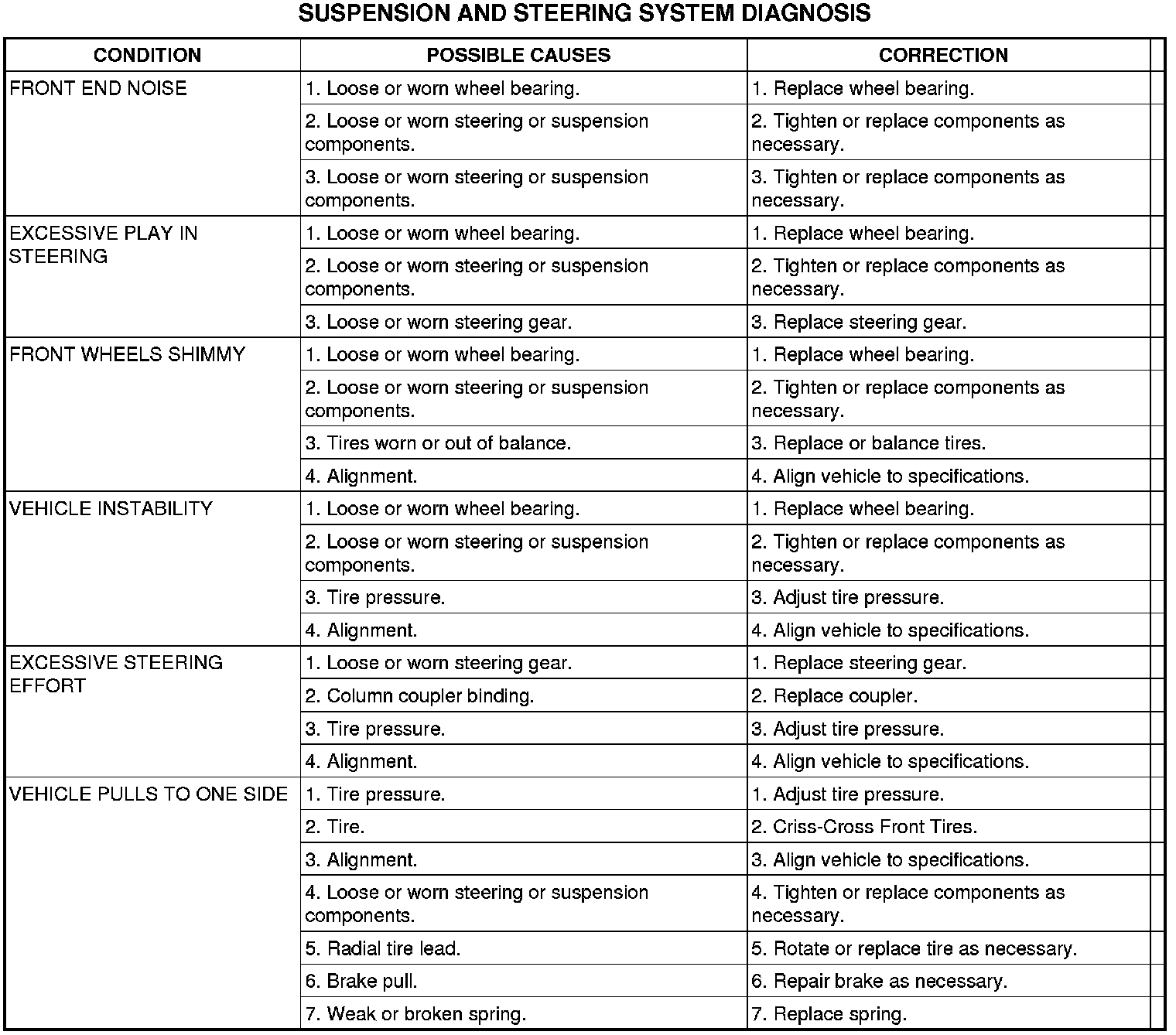 Before starting wheel alignment, the following inspection and necessary corrections must be completed. Refer to Suspension and Steering System Diagnosis Chart below for additional information.