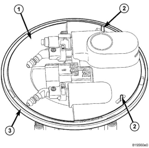 3. Rotate module until embossed alignment arrow points to center alignment mark. This step must be performed to prevent float from contacting side of fuel tank. Also be sure fuel fitting on top of pump module is pointed to drivers side of vehicle.